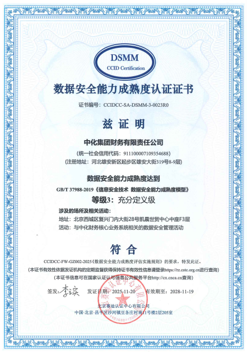 近日,中化财务公司通过了数据安全能力成熟度(DSMM)三级认证,成为国内最早通过该认证的财务公司之一,标志着中化财务公司在数据安全管理与保护领域达到了行业先进水平。