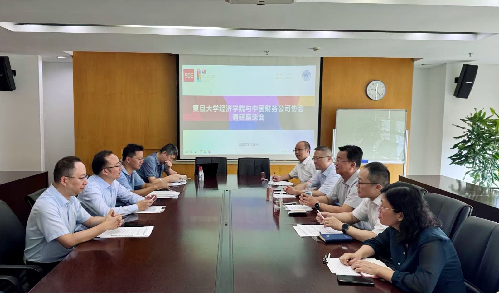 2025年8月22日上午,中国财务公司协会(以下简称“中国财协”)党委书记、常务副会长朱进元、上海电气集团财务有限责任公司董事长冯淳林、申能集团财务有限公司党委书记陈云波、通用技术集团财务有限责任公司党委书记、董事、总经理岳海涛、中国石化财务有限责任公司金融研究开发部负责人李勇等一行赴复旦大学经济学院进行调研,并与复旦大学经济学院副院长许闲及部分学院教授进行座谈,双方就财务公司高管授课进校园、财务公司专业理论体系重点课题研究、人才培养等事项进行了充分讨论并达成合作意向。